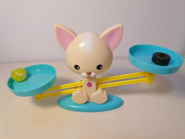 大家可千万别觉得天平有多复杂,在启蒙阶段,我们暂且抛去砝码,其实它和跷跷板一样,都是利用“杠杆原理”来比较轻重罢了。我经常给萌萌说,天平就是一个小号的跷跷板,是给一些“小东西”玩的跷跷板。