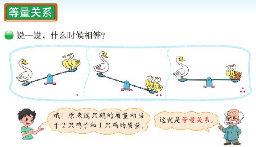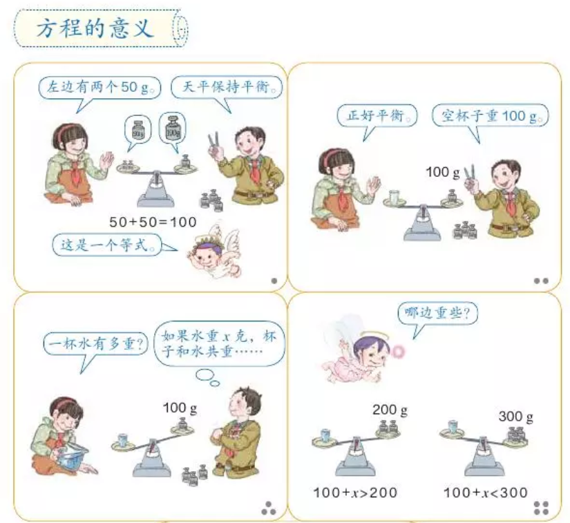 北师版教材四年级,人教版教材五年级学习方程,都是从等量关系入手,同样来自于天平: