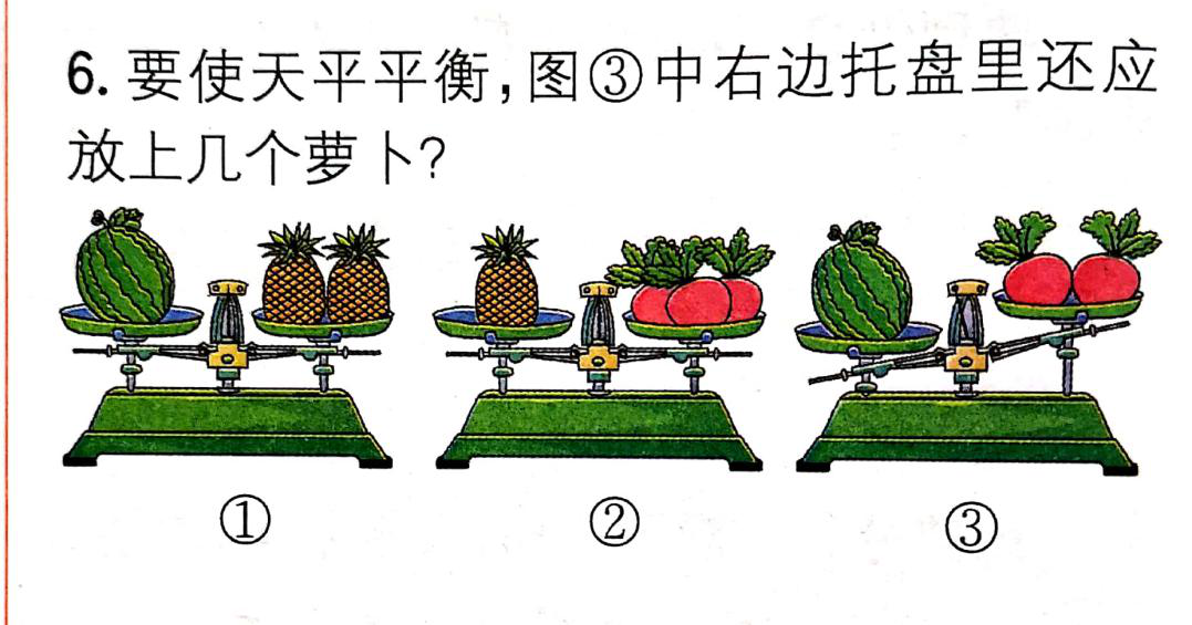 前期有了这些积累,一年级孩子会迎来更难的比较轻重的题目,同样涉及等量代换的思想: