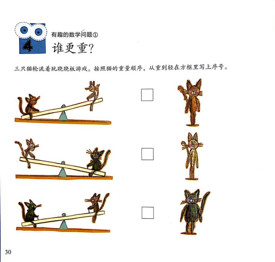 (▲这是《你好!数学》中《勇敢敏捷的猫》后给出的趣味数学题,需要孩子结合三个跷跷板上出现的情况,做出判断。)