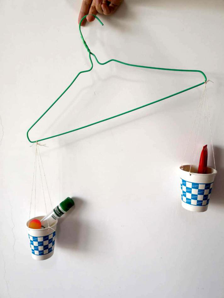有些家庭会给孩子准备天平,如果实在没有,也可以带着孩子一起动手做一个,工具家家都有,一个衣撑,两个一次性杯子,一些绳子即可。看,这是我和萌萌给各种“小东西”制作的跷跷板,虽然有点丑,但却是萌萌最爱的玩具之一呢。