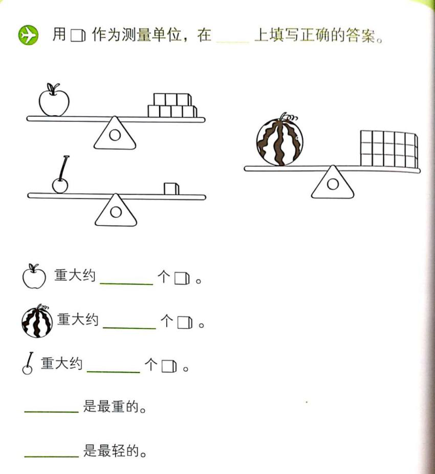 我们完全可以不停留在题目表面,咱们还可以继续玩下去:几个樱桃和苹果一样重?苹果再加上几个樱桃的重量就和西瓜一样重?遇到这样的问题,孩子就要用积木来代替它们的重量进行思考:一个樱桃大约重1个积木,1个苹果大约重7个积木,7个积木也就是7个樱桃,所以7个樱桃和苹果一样重。