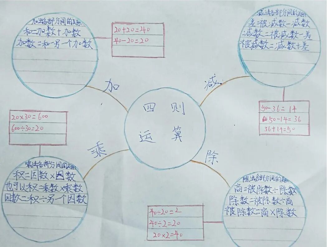 如下面这两份思维导图,请你观察一下他们的内容,如果单从美观程度来观察,肯定是第一份更优秀,甚至第二份可以说有点难看,但具体看内容,第二份思维导图将所学知识串联起来,完全打通了加减乘除四则运算的内在联系,有自己的思考在里面,更有深度。