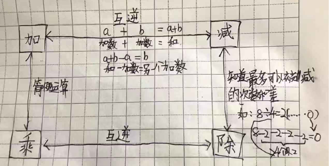很多学生在学习运算律时遇到了困难,原因之一就是它们将各个运算律拆分开来,但实际这些运算律是有内部联系的,小郭同学就将各种运算律按照四则运算进行分类,这样在大脑中按照加、减、乘、除进行记忆,再去寻找内部的联系和区别,使用起来就更加得心应手了。