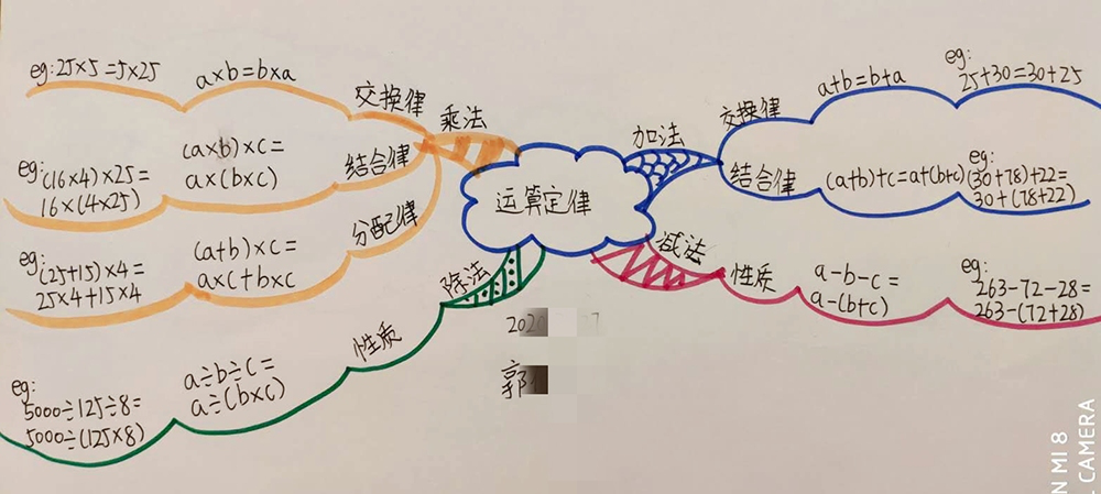 这是我的学生在整理复习《运算定律》这一单元时,梳理出的思维导图。