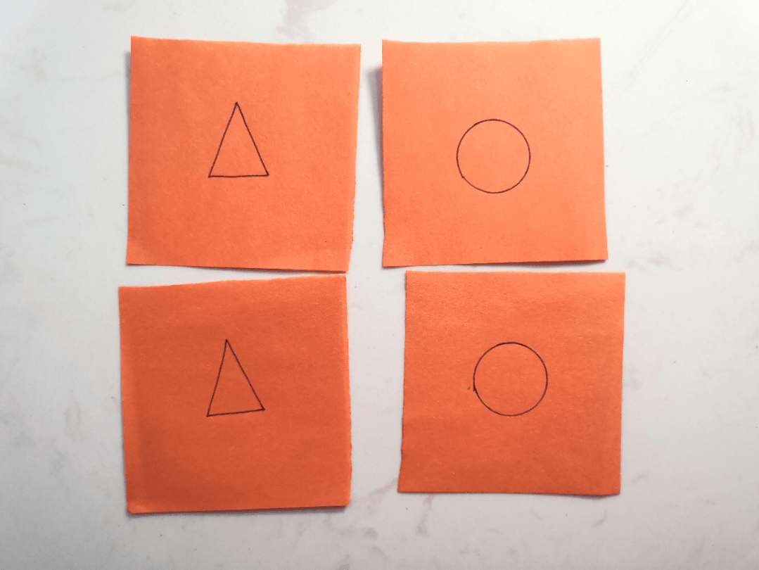 3、每次可以翻开两张卡片,若卡片上的图形不一样,就再扣到桌子上,若图形一样,则两张卡片都拿走;