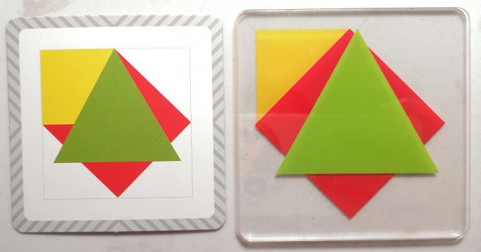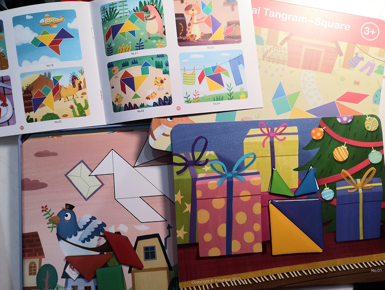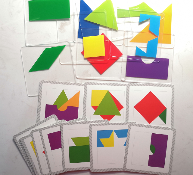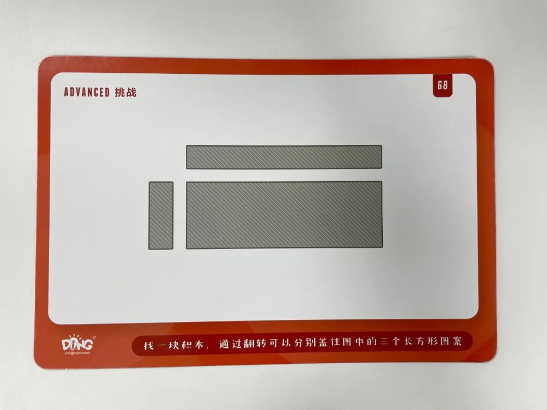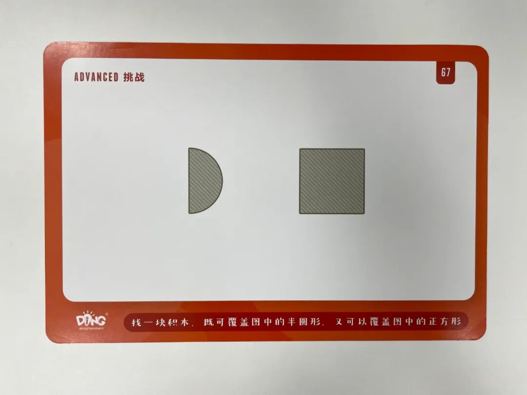 很适合这个年龄段的孩子玩,他们利用手中的基础图形,拼组出题卡上的组合图形,在拼组的过程中,孩子需要根据图形的一部分推断出整个图形,加深孩子了解图形的特点。