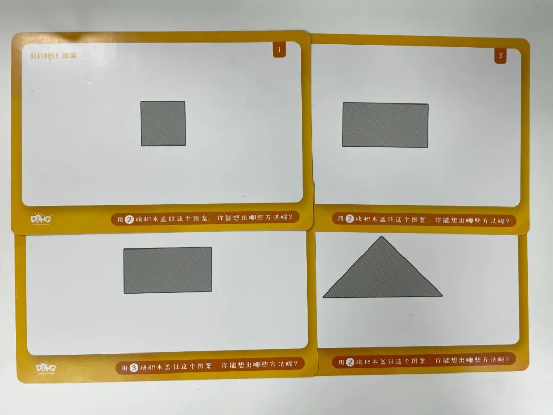 孩子理解了面在体上,我们就可以利用启蒙町积木配套的启蒙图形题卡,做一些更复杂的图形拼组题目,同时将前面做过的题卡拿出来,进行开放式的引导,让孩子在尝试新答案的过程中开放思维,加深对“面在体上”的理解。