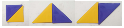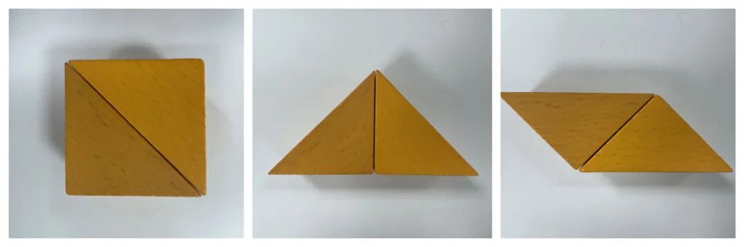 利用两个相同的三角形,你能拼出什么图形呢?这个游戏用积木或者七巧板都可以。