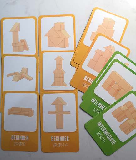 玩这套题卡时,每张题卡的答案都不是唯一的,这也得益于启蒙町积木的尺寸设计,让积木可以有更多的组合形式。家长一定要多鼓励孩子,寻找答案的更多可能性,孩子根据投影寻找积木的过程,思维从立体空间抽象到平面,这就需要充分发挥他们的想象力。