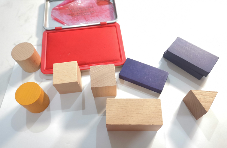 准备一些不同形状的积木,印出它们每个面的形状,可以用积木沾了印泥,在纸上印一印,也可以用彩笔在纸上描一描。这个游戏,孩子都会很喜欢,而且能帮助他们感知二维与三维图形的联系。