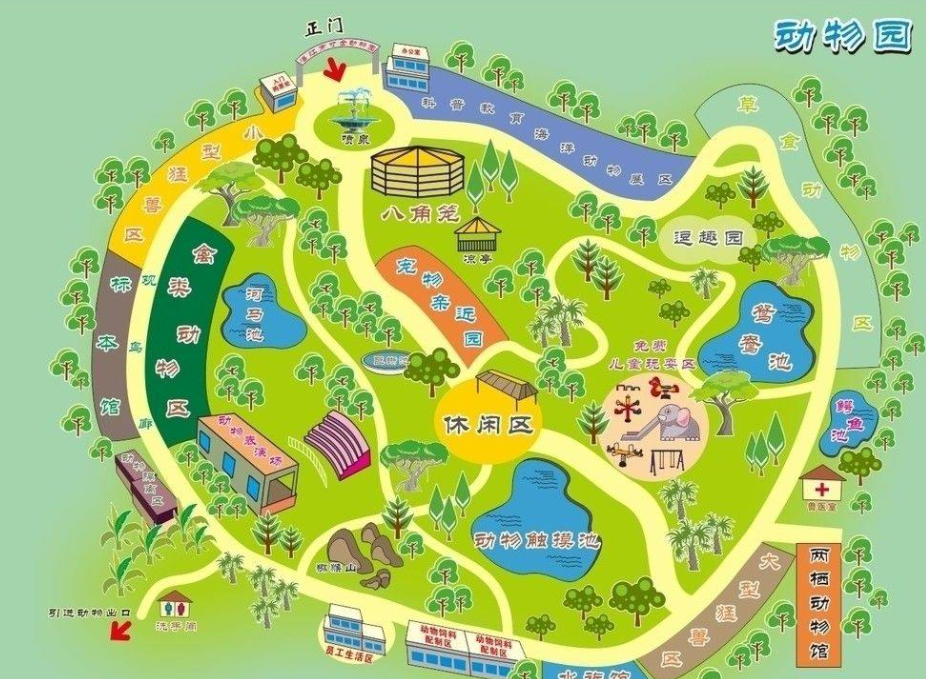 有了前期的铺垫,就可以开始尝试让孩子在场景中运用导览图了,如去动物园时,让孩子按照导览图说说如何找到熊猫馆。孩子起初的语言不会很规范,他可能会用手指着说先往这走,再往那走等等,我们要引导孩子说清楚方向-往哪走,距离-走多远,位置-走到哪(拐弯或到达目的地),如沿着这条路往前走到喷泉,然后向右拐,再走两个路口,就到熊猫馆了。