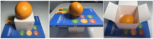 书本在下面,水果和盒子在上面,水果在盒子旁边......