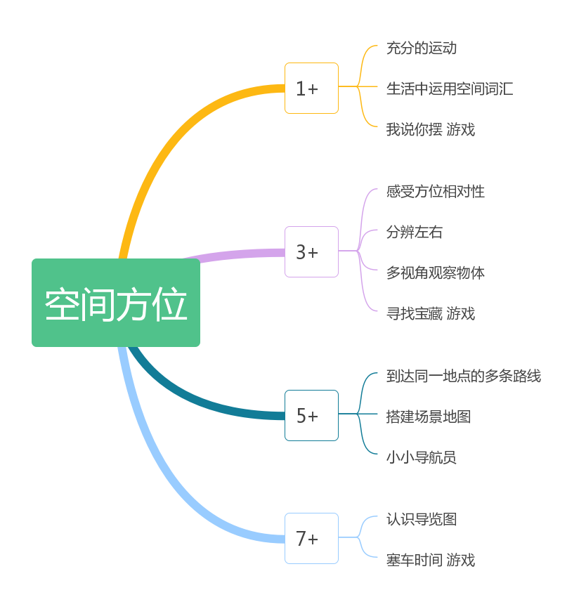 3岁+ 在之前认识简单方位词的基础上,这个年龄的孩子可以感受方位的相对性,并开始学习分辨左、右这两个方向。