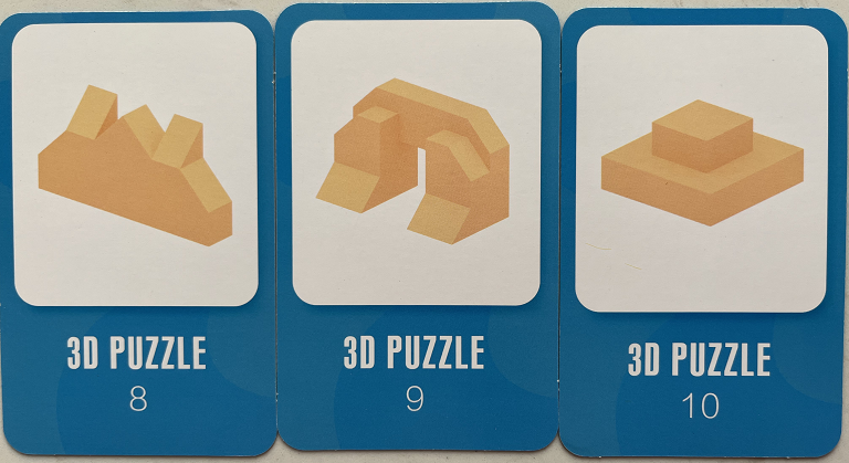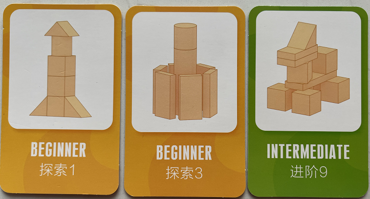 有了简单的拼组经验之后,就可以按照题卡做一些搭建了。一定要从最简单,有明确区分线的题卡开始,便于孩子根据提示完成。这个拼组的过程,帮助孩子初步搭建立体拼图规则:从下往上一层一层的搭建。