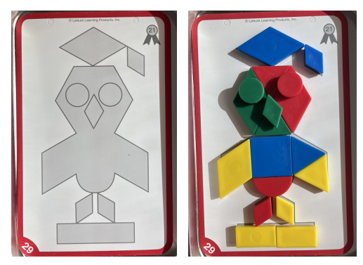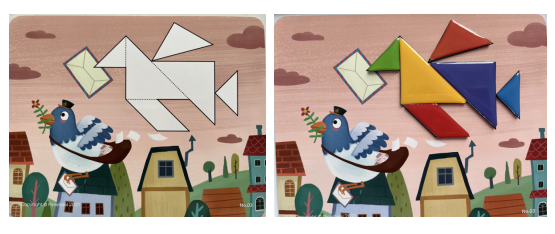 有了之前的积累后,再一步步增加难度,孩子根据图形的特点,在没有提示的情况下进行拼组,最终与给出的图形模板做匹配,不仅深化孩子对于图形特点的理解,而且每一个图形,在孩子心中都动了起来,旋转、翻转不间断。
