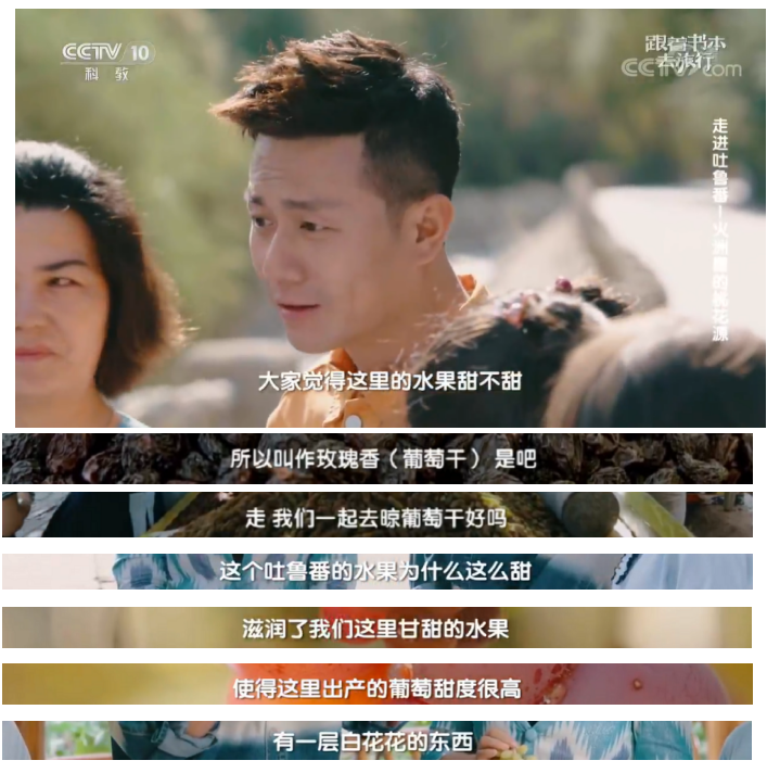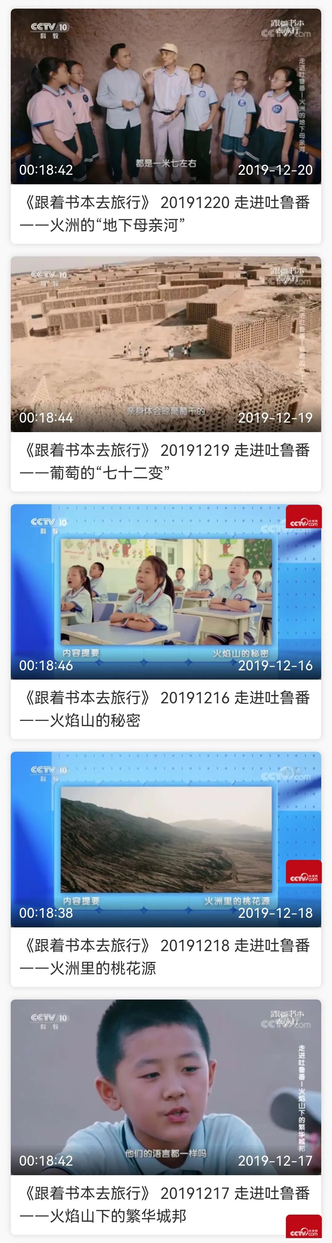 我特别喜欢这部纪录片的表现形式,每期以一篇课文为大主题,然后再细分子主题,比如走进吐鲁番这一期,就细分了火焰山下的繁华城邦、火洲里的桃花源、火焰山的秘密、葡萄的“七十二变”、火洲的“地下母亲河”等五集,每一集讲述的主题,从题目上就能清晰的看出。这样很便于孩子带着自己的疑问,选择需要的节目观看,也可以根据自己的兴趣做选择。