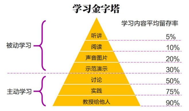 我们来看,在学习金字塔中提到,听讲属于被动学习,24小时后学习内容的平均留存率才5%,更何况到下次考试呢,孩子会才怪了。所以我们应该选择最有利于孩子长久记忆的学习方式,即让孩子当老师,教授给别人。