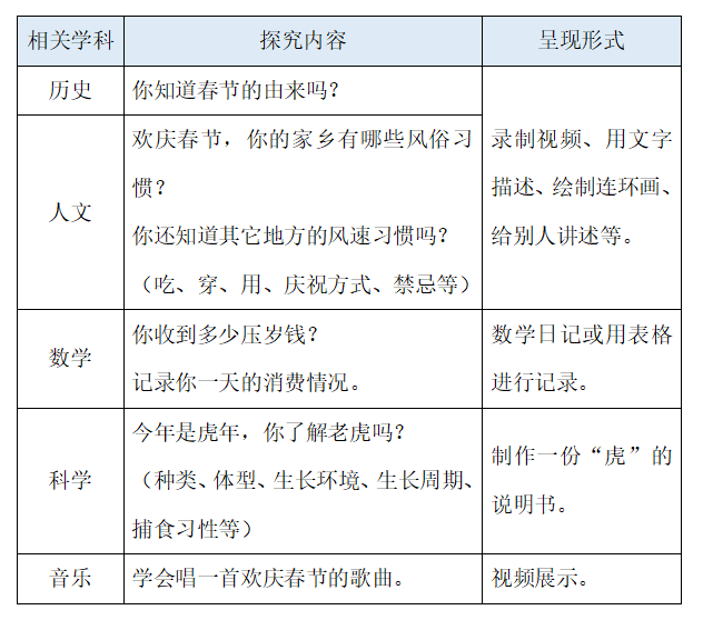 在之前的文章中多次和大家提到过项目式学习,作为最促进孩子全方位素养提升的学习方式之一,这个寒假,咱们就可以围绕即将到来的虎年春节,做一次项目式学习。下面是我想到孩子能做的的相关探究,抛砖引玉,相信大家还会补充很多好主意的。