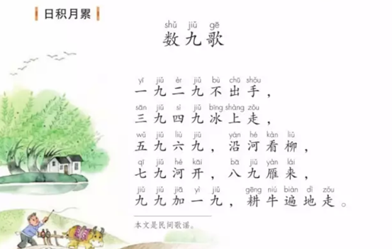 在统编教材二上的语文园地七中,就有九九歌,需要孩子理解加背诵。而“数九”就是从冬至的次日开始的。