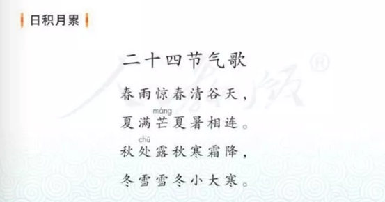 统编教材二下的语文课本中,就有关于二十四节气的学习: