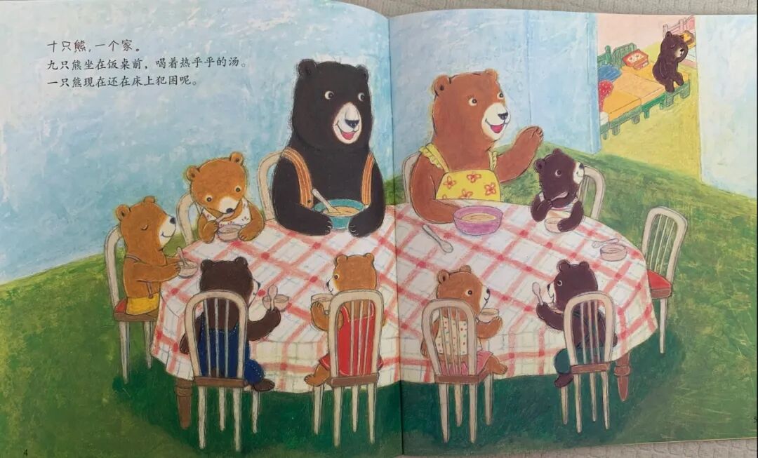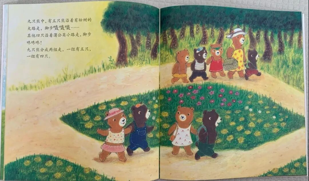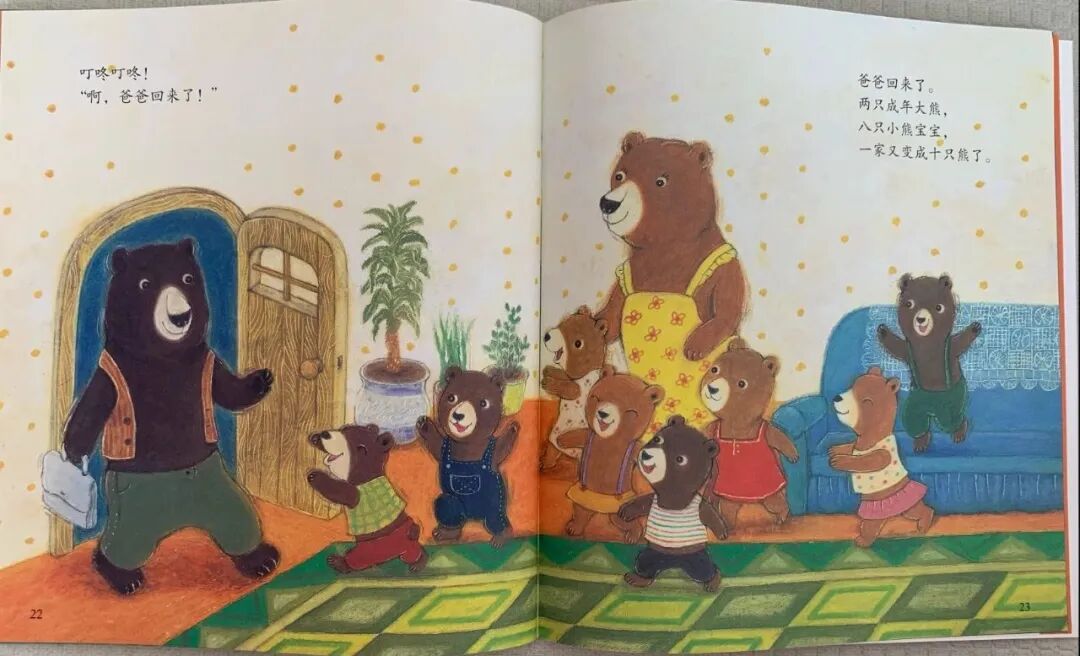 孩子在读绘本的过程中,用手指配合,点着数一数图中有几只熊,分成了哪几部分,如9只熊围坐在餐桌旁,1只熊还在赖床;8只小熊,有4只熊宝宝去采摘草莓,另外4只去追蝴蝶。