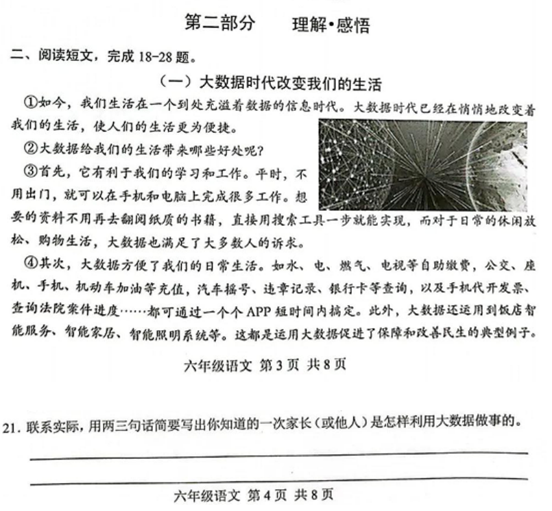 这道阅读理解题目关于大数据时代展开,孩子首先要在生活中有所了解,还要经历过用大数据解决问题的过程,才能很好的回答问题。