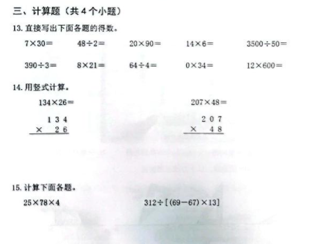 还有家长咨询我,“双减”后是不是计算题目不再重要了?这种观点肯定是不对的。我们来看这次北京的期末试卷: