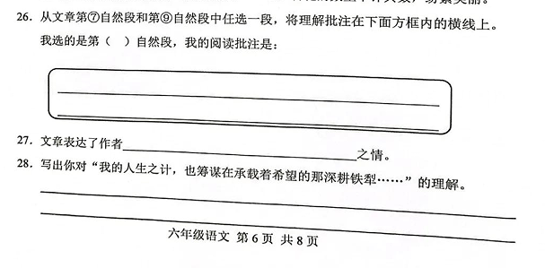 语文卷子中出现了两篇较长的课外阅读,再加一大一小两篇作文,阅读慢的孩子可能都没有时间把文章细读完,更别说还要写作了。