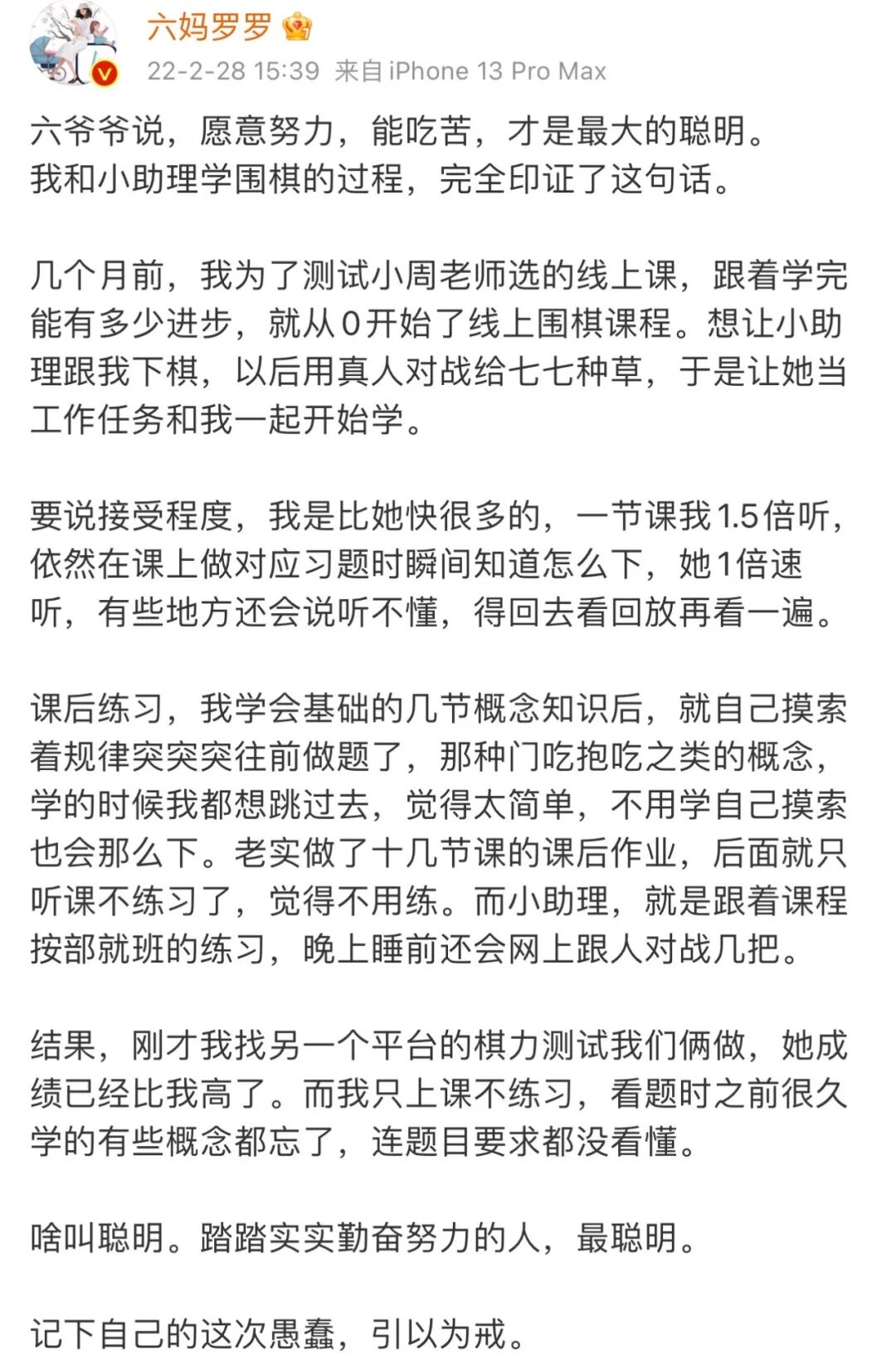 “围棋下的好的孩子,到了高年级,数学学习不用发愁”,这句话,应该很多人都听过,但请一定要注意看重点,那句话说的是围棋能下好的孩子,高年级数学不用发愁,而非学了围棋,就一定学数学不发愁。买过课不等于学会,围棋学习能带来的各种好处,都是在不断的练习中逐渐培养的,任何技能水平的提高,都需要刻意练习。我一段时间不练后,即使学习效率远高于小助理,学习效果也比经常复习,每日练习的她要差。