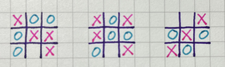 不过我和萌萌玩的最多的还是井字游戏,这是一种在3×3的格子中进行的连珠游戏,和五子棋类似,但进行起来会更快。游戏时,我俩分别在方格中画○和×作为标记,当任一种标记三个连成一条直线,则为获胜。