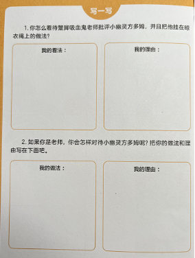 比如在《小幽灵去上学》这本书中,就让孩子谈一谈“你怎么看待蹩脚吸血鬼老师批评小幽灵方多姆,并且把他挂在晾衣绳上的做法?”和“如果你是老师,你会怎样对待小幽灵方多姆?”