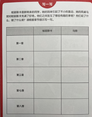 再比如《班上的女巫》这本书后的阅读单中,让孩子写一写帕丽斯卡同桌两人之间发生的趣事。为了让孩子更清楚写什么,列出了清晰的表格,引导孩子一章一章、分角色来描述。这样就把叙述的方向确定了,孩子很清楚写什么内容。