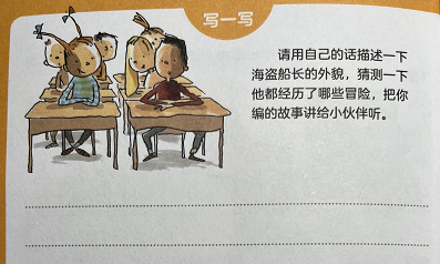比如在《教室里的海盗》这本书中,就鼓励孩子猜测海盗船长经历了哪些冒险,自己创编故事。这样的设计,不仅能增强孩子的想象力,而且孩子在创编故事的时候,语言表达力、总结概括的能力都会得到提升,同时他还会关注逻辑的合理性。