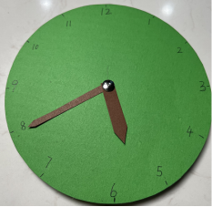 之后我们用一个图钉,扎在两根针上,穿透表盘,背面扎在一块橡皮上,一块简易的钟表模型就完成了。