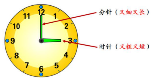 认识时间,首先要分清时针和分针,相对来说,时针短粗,分针细长;