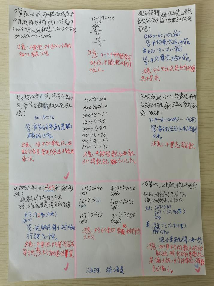 在A4纸上画井字格,就可以分出九个框框,这就确定了针对本学期内容,孩子只能整理九道题目。这九道题目不再局限于自己的错题,而是在本学期的学习中遇到的所有题目中,自己觉得容易出错的,或者是很重要的题目。每道题目也是由错题、解题过程和错因分析三部分组成。