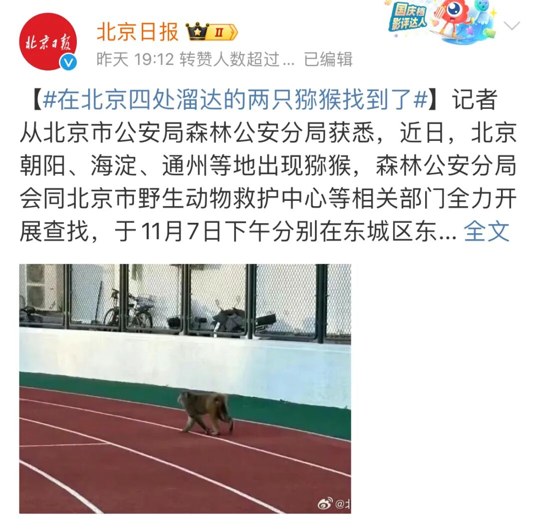 11月7日北京日报发布消息:在北京四处溜达的两只猴找了。