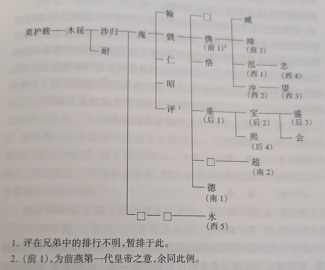 ▲上图:慕容诸燕疆域对照图;下图:慕容氏世系简图。图源/百度百科、隋唐帝国形成史论一书