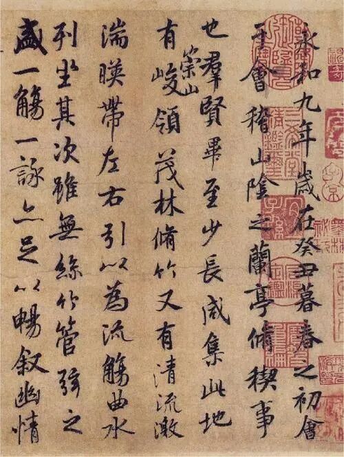 永和九年暮春之初,王羲之与群贤在会稽山阴之兰亭,赋诗饮酒,之后作了“天下第一行书”——《兰亭集序》。