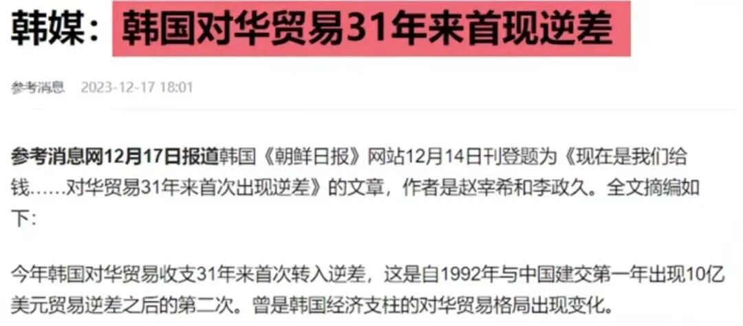 但是现在啊,估计老周已经懒得喊了,为什么啊?23年底,韩国正式公布了一项数据,即对华贸易,31年来与我国贸易第一次出现逆差。