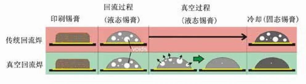 真空回流焊接工艺是在回流焊接过程中引入真空环境的一种回流焊接技术,相对于传统的回流焊,真空回流焊在产品进入回流区的后段,制造一个真空环境,大气压力可以降到 5mbar(500pa)以下,并保持一定的时间,从而实现真空与回流焊接的结合,此时焊点仍处于熔融状态,而焊点外部环境则接近真空,由于焊点内外压力差的作用,使得焊点内的气泡很容易从中溢出,焊点空洞率大幅降低。低的空洞率对存在大面积焊盘的功率器件尤其重要,由于高功率器件需要通过这些大面积焊盘来传导电流和热能,所以减少焊点中的空洞,可以从根本上提高器件的导电导热性能。