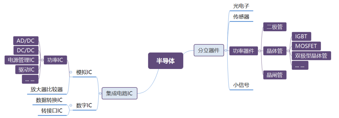 功率半导体包括两个部分:功率器件和功率IC。功率器件是功率半导体分立器件的分支,而功率IC则是将功率半导体分立器件与各种功能的外围电路集成而得来。功率半导体的功能主要是对电能进行转换,对电路进行控制,改变电子装置中的电压和频率,直流或交流等,均具有处理高电压、大电流的能力。