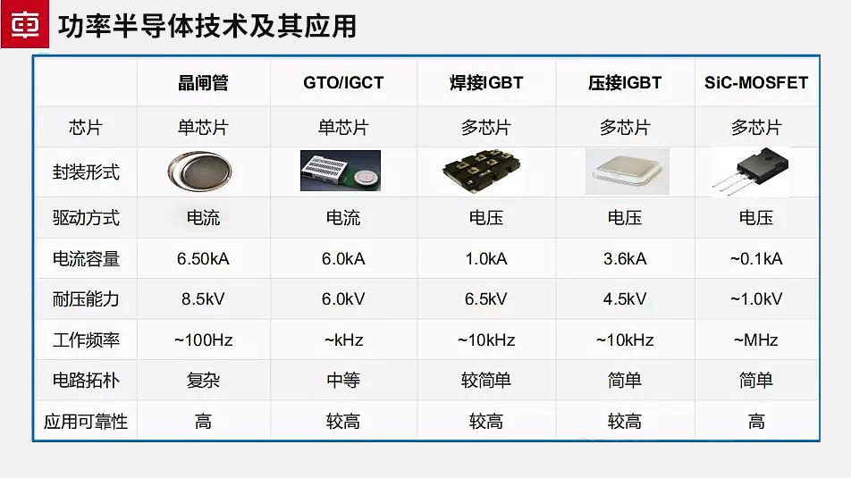 目前主流、使用较多的半导体器件,一是晶闸管,它可以输出较大功率,但频率相对较低,主要用于直流输电和大功率低频电源等;二是IGCT,它是将GTO与门极驱动电路以低感方式集成在一起,这样可以改善关断性能,此器件目前主要用于大功率电机传动,包括船舶驱动、海上风电等;三是IGBT,自上世纪90年代突破技术瓶颈以后,已经实现产业化和大规模应用,当前大功率IGBT最高可实现6500V,其应用方式较广,包括轨道交通、光伏发电、汽车电子等,是当前主流开关器件。