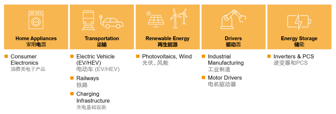 作为新型功率半导体器件的主流器件,IGBT应用非常广泛,如家用电器、电动汽车、铁路、充电基础设施、充电桩,光伏、风能,工业制造、电机驱动,以及储能等领域。