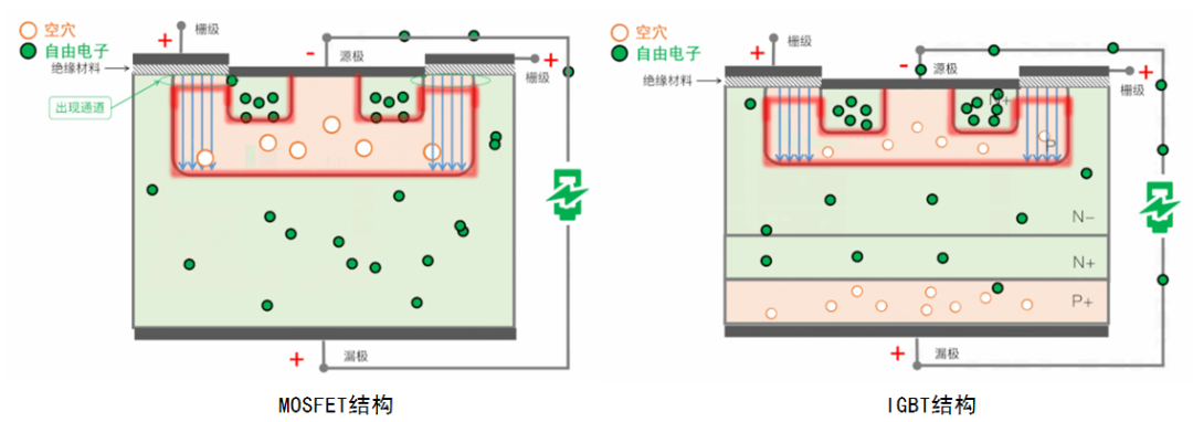 事实上IGBT的结构与MOSFET十分接近,只是在其背面增加了N+和P+层,“+”意味着更高的自由电子或者空穴密度。从而IGBT在保留MOSFET优点的同时,增加了载流能力和抗压能力。