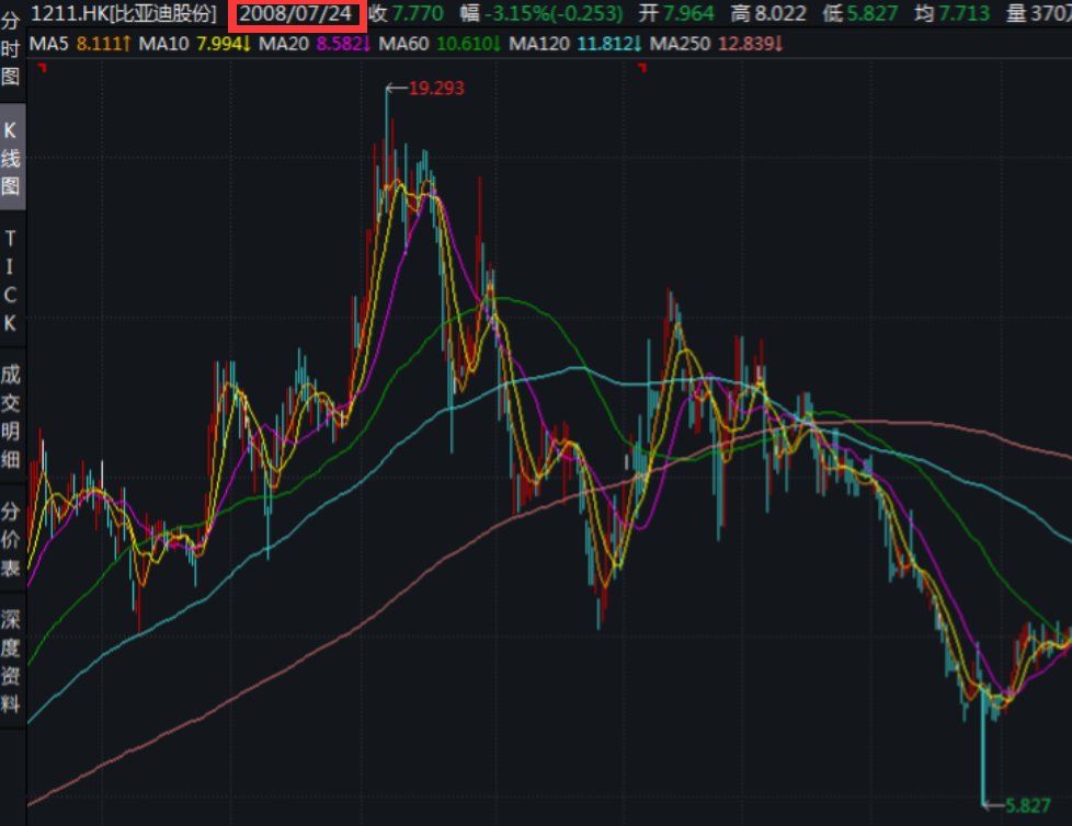 2008年7月24日 比亚迪股价跌至5.827港元/股