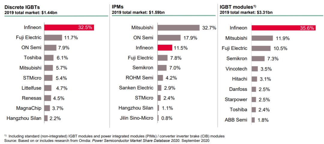 短短四年时间,英飞凌的第六代IGBT承受工作电压水平从之前的4500V提高到6500V,全球市占率超过一半,占据绝对领先地位。
