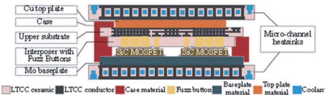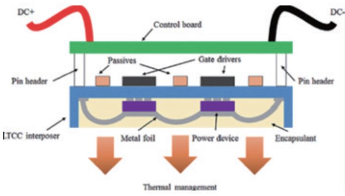 为进一步降低寄生效应,使用多层衬底的2.5D和3D模块封装结构被开发出来用于功率芯片之间或者功率芯片与驱动电路之间的互连。在2.5D结构中,不同的功率芯片被焊接在同一块衬底上,而芯片间的互连通过增加的一层转接板中的金属连线实现,转接板与功率芯片靠得很近,需要使用耐高温的材料,低温共烧陶瓷(LTCC)转接板常被用于该结构,下图为一种2.5D模块封装结构。