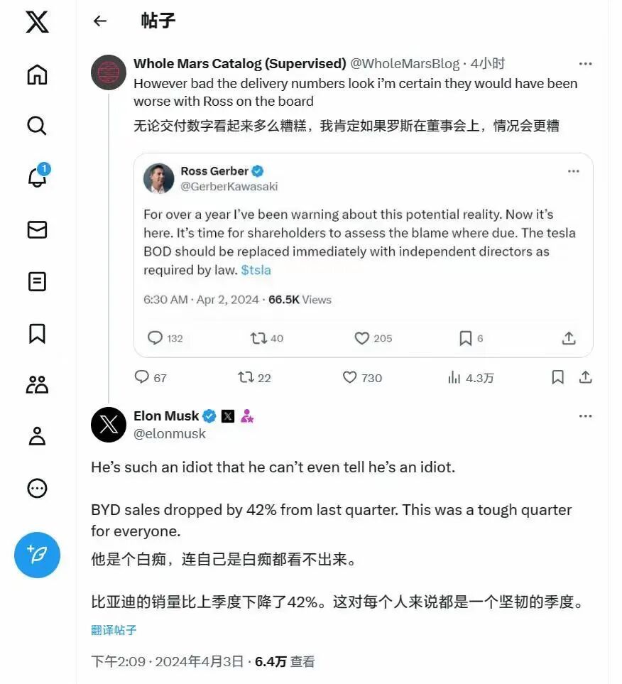 次日,马斯克在社交平台上迅速作出回应,他不客气地称罗斯为“愚蠢而不自知的人”。这位科技巨头不仅展现了他的强硬态度,更巧妙地借机提到了竞争对手比亚迪,似乎暗示着特斯拉的下滑销量与市场竞争有关。